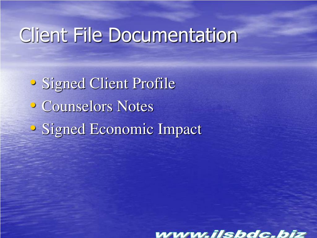 Client File Documentation • Signed Client Profile • Counselors Notes • Signed Economic Impact www.ilsbdc.biz