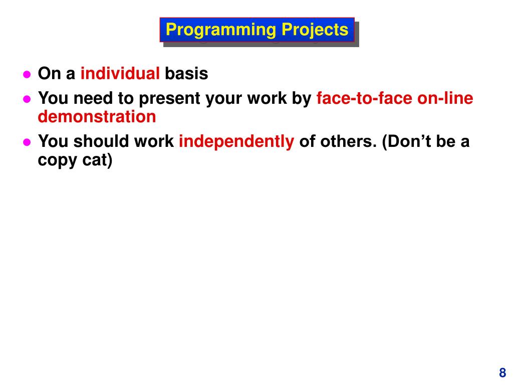 Programming Projects • On a individual basis • You need to present your work by face-to-face on-line demonstration • You should work independently of others. (Don’t be a copy cat)