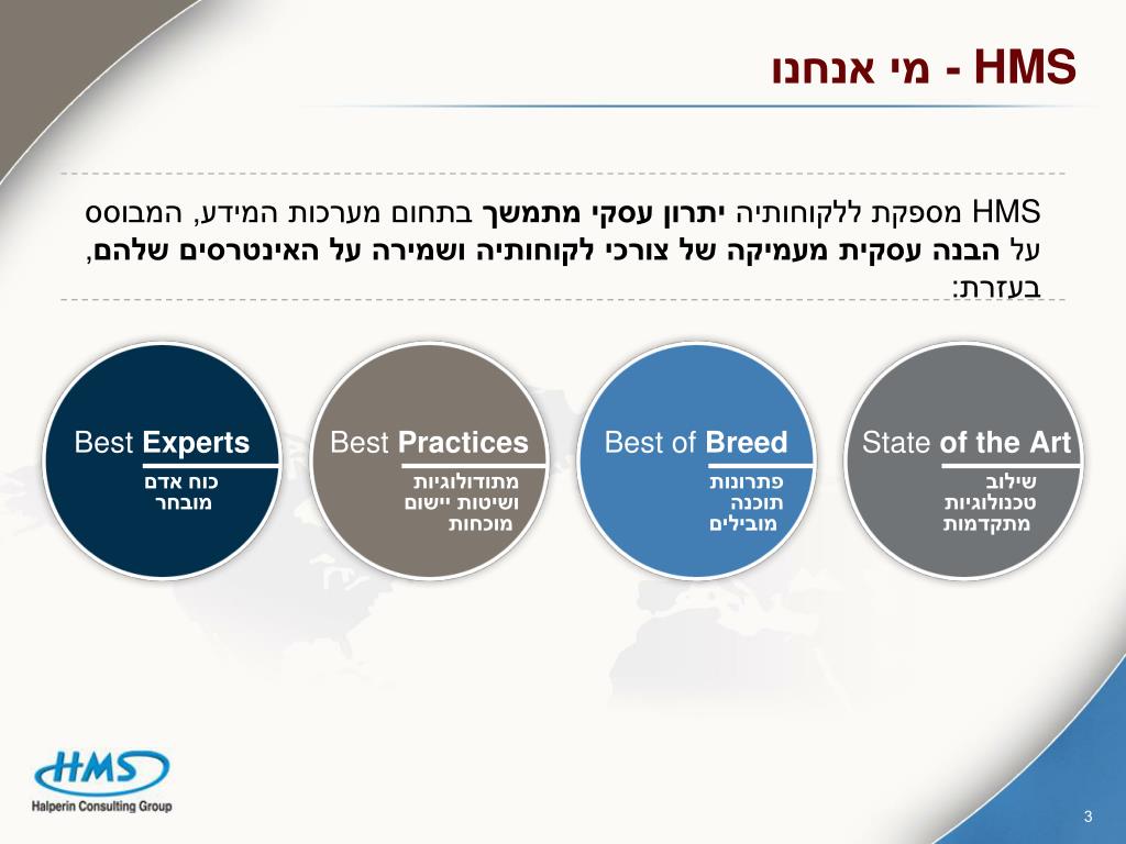 HMS מספקת ללקוחותיה יתרון עסקי מתמשך בתחום מערכות המידע, המבוסס על הבנה עסקית מעמיקה של צורכי לקוחותיה ושמירה על האינטרסים שלהם, בעזרת: Best Experts Best Practices Best of Breed State of theArt כוח אדם מובחר מתודולוגיות ושיטות יישום מוכחות פתרונות תוכנה מובילים שילוב טכנולוגיות מתקדמות HMS - מי אנחנו