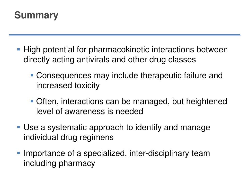 Summary High potential for pharmacokinetic interactions between directly acting antivirals and other drug classes Consequences may include therapeutic failure and increased toxicity Often, interactions can be managed, but heightened level of awareness is needed Use a systematic approach to identify and manage individual drug regimens Importance of a specialized, inter-disciplinary team including pharmacy