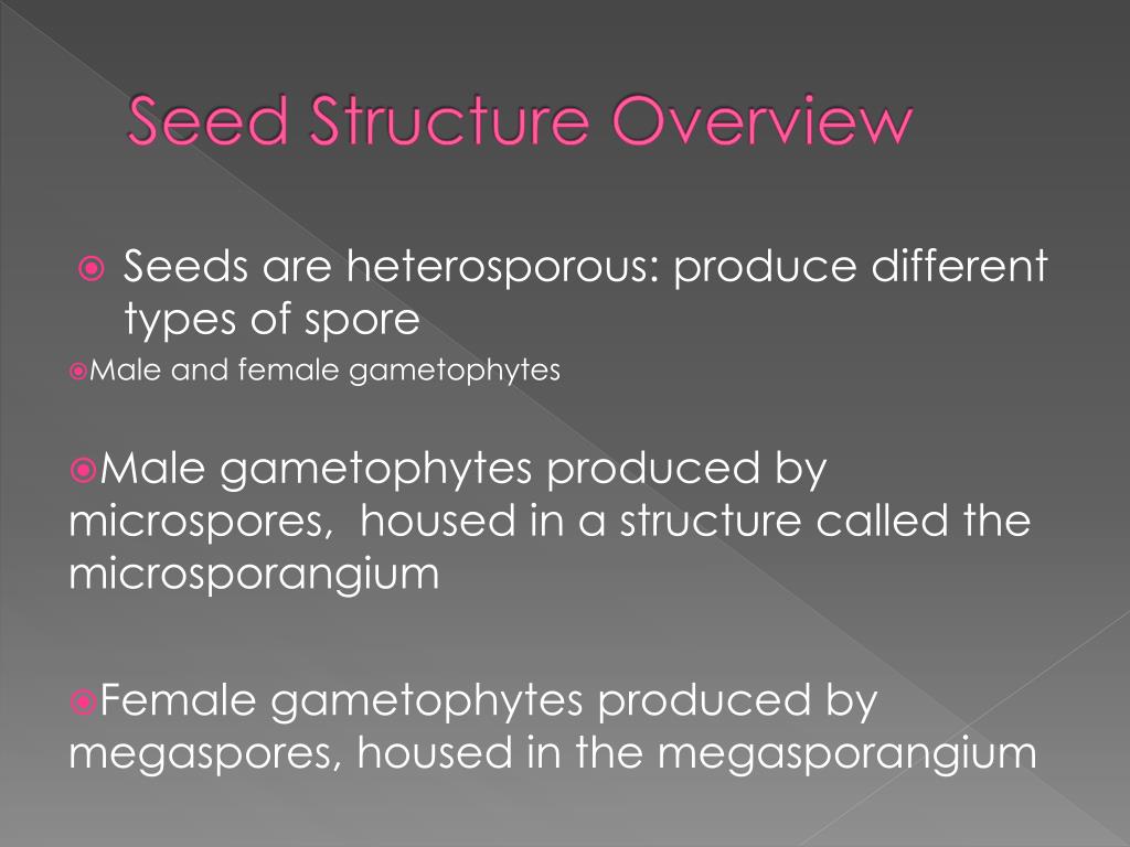 Seed Structure Overview • Seeds are heterosporous: produce different types of spore • Male and female gametophytes • Male gametophytes produced by microspores, housed in a structure called the microsporangium • Female gametophytes produced by megaspores, housed in the megasporangium