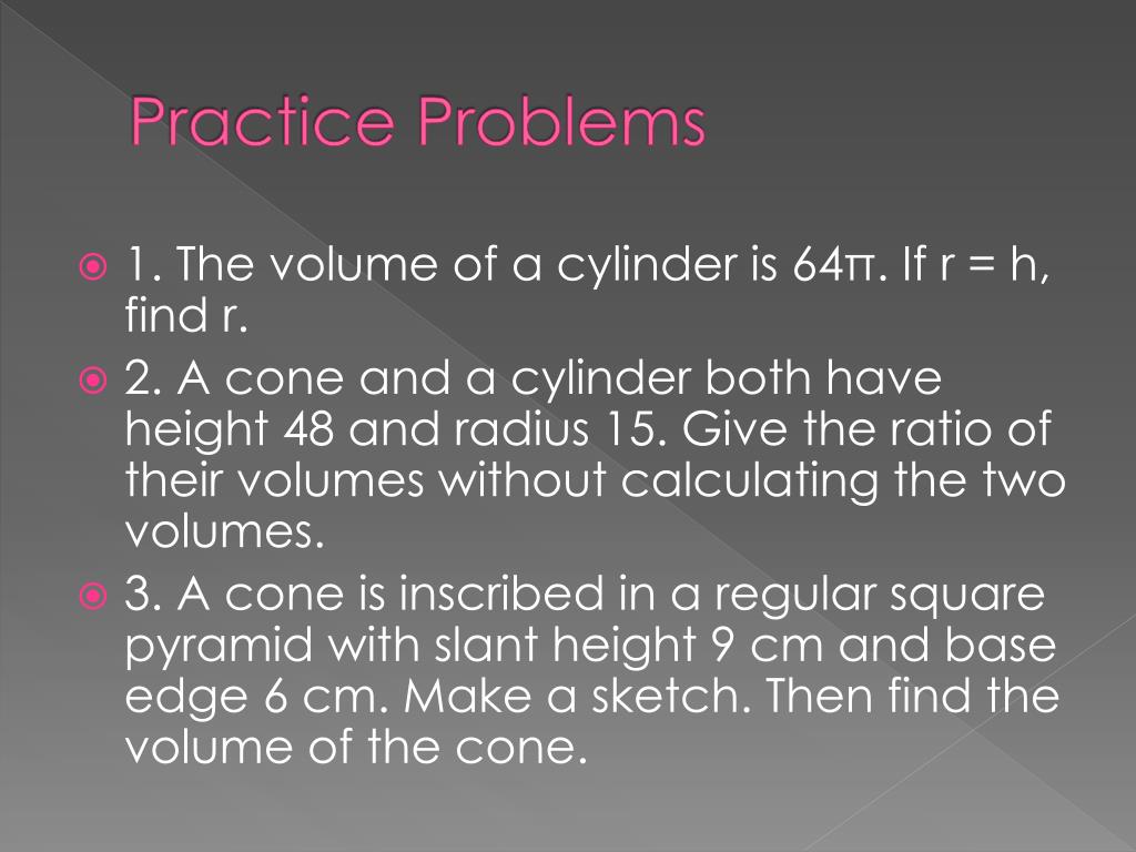 Practice Problems • 1. The volume of a cylinder is 64π. If r = h, find r. • 2. A cone and a cylinder both have height 48 and radius 15. Give the ratio of their volumes without calculating the two volumes. • 3. A cone is inscribed in a regular square pyramid with slant height 9 cm and base edge 6 cm. Make a sketch. Then find the volume of the cone.