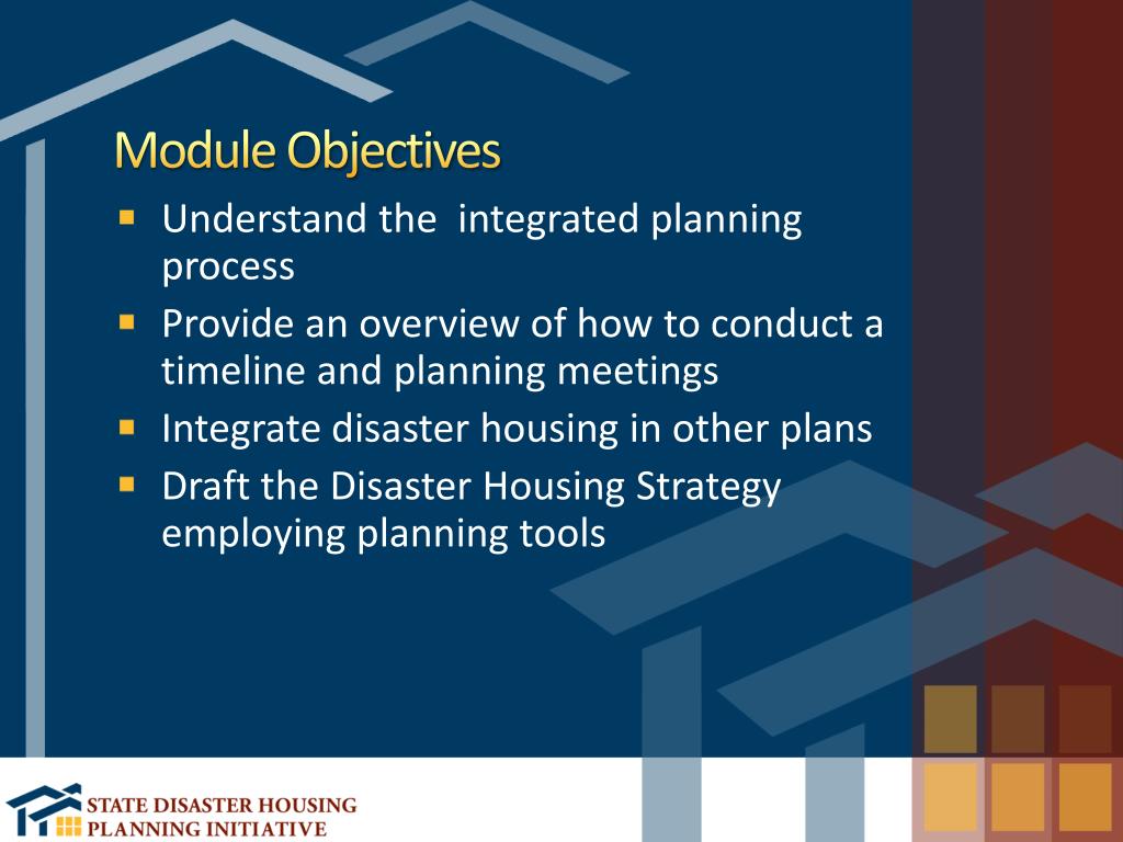 Florida Disaster Housing Strategy Module 3: The Planning Process. Module Objectives. Understand the integrated planning process Provide an overview of how to conduct a timeline and planning meetings Integrate disaster housing in other plans