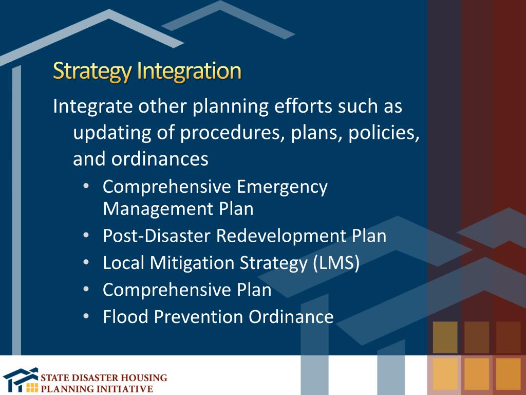 Strategy Integration Integrate other planning efforts such as updating of procedures, plans, policies, and ordinances • Comprehensive Emergency Management Plan • Post-Disaster Redevelopment Plan • Local Mitigation Strategy (LMS) • Comprehensive Plan • Flood Prevention Ordinance