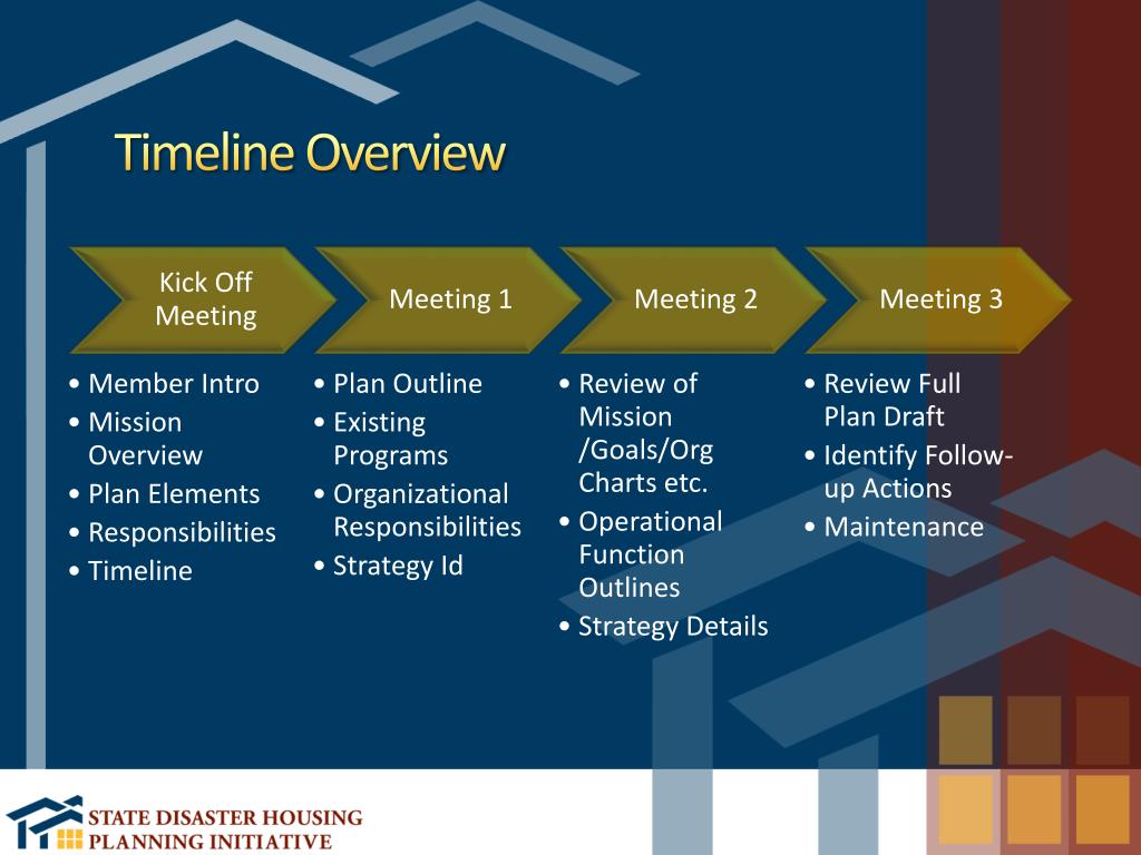 Kick Off Meeting • Taskforce members skills, experience, and resources • Disaster housing mission overview and key components • Taskforce member expectations and responsibilities • Deliverables and timeline of planning process • Disaster housing goals and objectives • Review of key background documents • Community risks