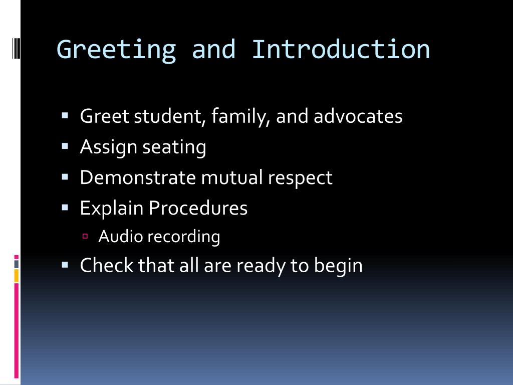 Greeting and Introduction • Greetstudent, family, and advocates • Assign seating • Demonstrate mutual respect • Explain Procedures • Audio recording • Checkthat all are ready to begin