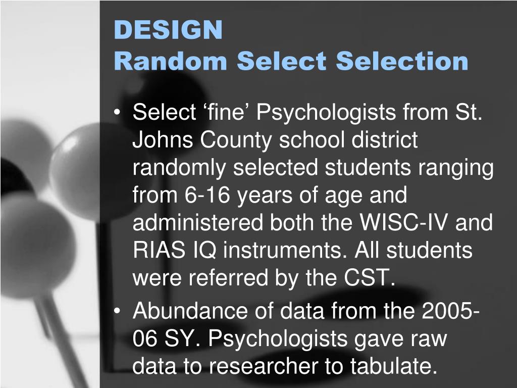 DESIGNRandom Select Selection • Select ‘fine’ Psychologists from St. Johns County school district randomly selected students ranging from 6-16 years of age and administered both the WISC-IV and RIAS IQ instruments. All students were referred by the CST. • Abundance of data from the 2005-06 SY. Psychologists gave raw data to researcher to tabulate.