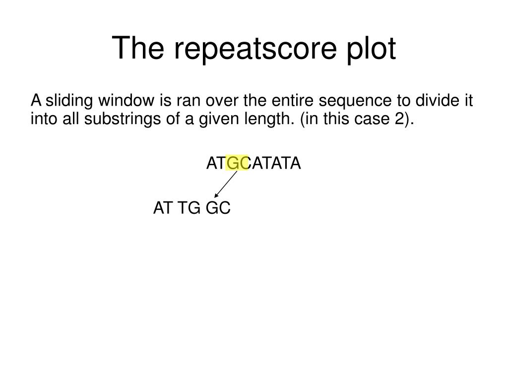 The repeatscore plot A sliding window is ran over the entire sequence to divide it into all substrings of a given length. (in this case 2). ATGCATATA AT TG GC CA AT TA AT TA AT Occurs 3 time(s) TG Occurs 1 time(s) GC Occurs 1 time(s) CA Occurs 1 time(s) TA Occurs 2 time(s)