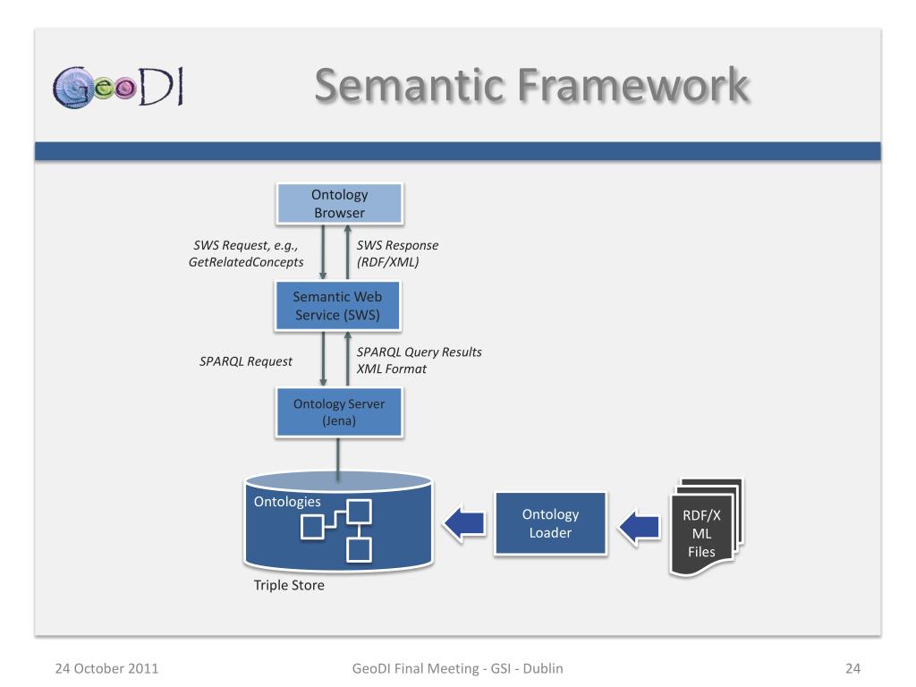 Semantic Framework Ontology Browser SWS Request, e.g., GetRelatedConcepts SWS Response (RDF/XML) Semantic Web Service (SWS) SPARQL Query Results XML Format SPARQL Request Ontology Server (Jena) Ontologies RDF/XML Files Ontology Loader Triple Store GeoDI Final Meeting - GSI - Dublin