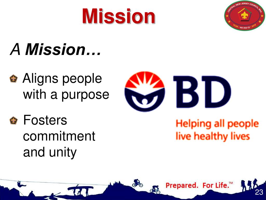Mission • A Mission… • Aligns people with a purpose • Fosters commitment and unity