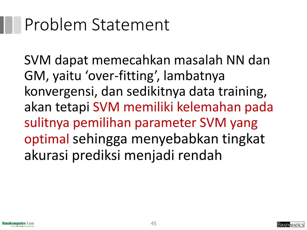 Problem Statement SVM dapat memecahkan masalah NN dan GM, yaitu ‘over-fitting’, lambatnya konvergensi, dan sedikitnya data training, akan tetapi SVM memiliki kelemahan pada sulitnya pemilihan parameter SVM yang optimal sehinggamenyebabkantingkatakurasiprediksimenjadirendah