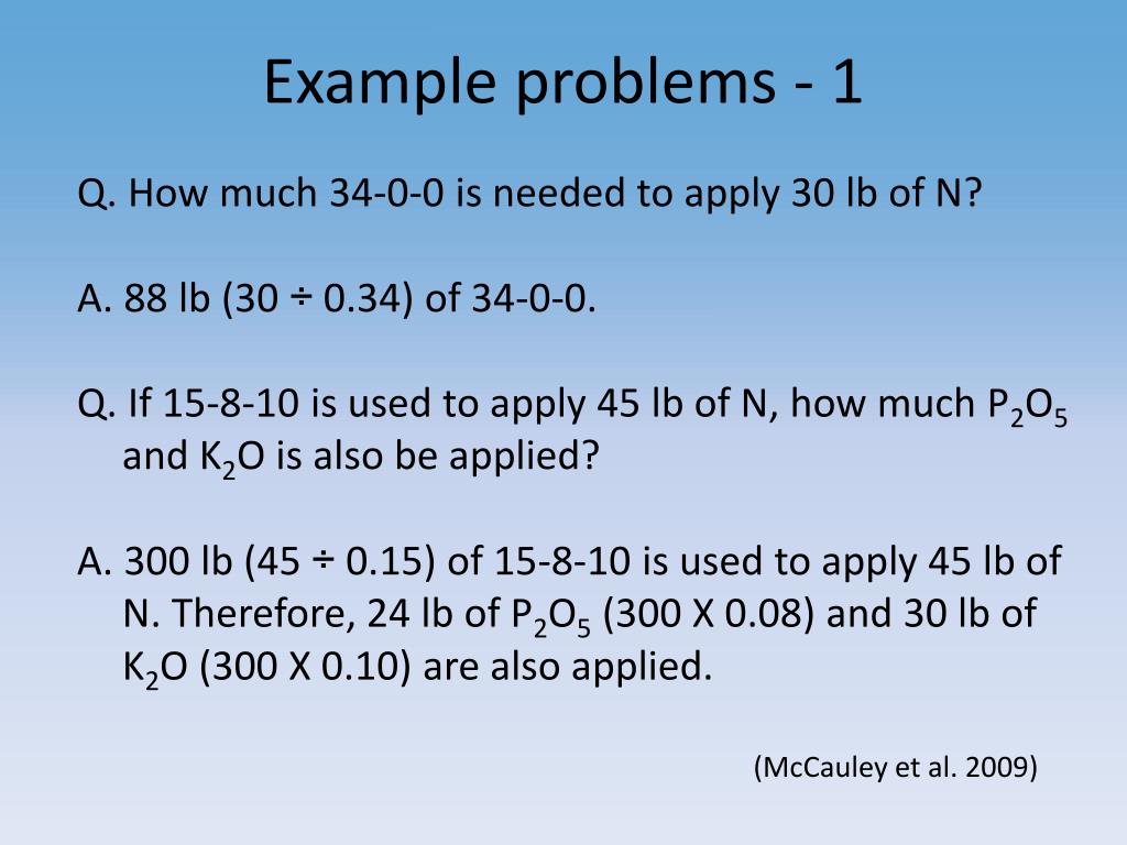 Example problems - 1 Q. How much 34-0-0 is needed to apply 30 lb of N? A. 88 lb (30 ÷ 0.34) of 34-0-0. Q. If 15-8-10 is used to apply 45 lb of N, how much P2O5 and K2O is also be applied? A. 300 lb (45 ÷ 0.15) of 15-8-10 is used to apply 45 lb of N. Therefore, 24 lb of P2O5 (300 X 0.08) and 30 lb of K2O (300 X 0.10) are also applied. (McCauley et al. 2009)