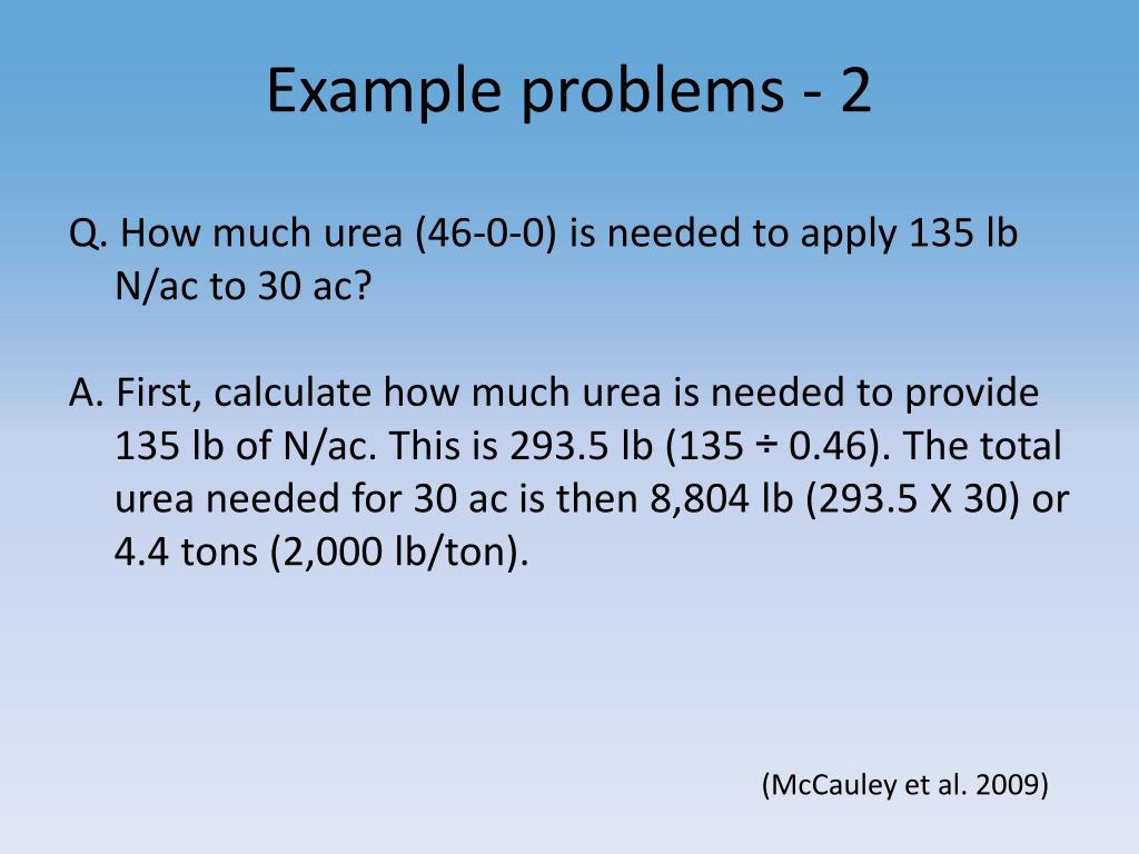 Example problems - 2 Q. How much urea (46-0-0) is needed to apply 135 lb N/ac to 30 ac? A. First, calculate how much urea is needed to provide 135 lb of N/ac. This is 293.5 lb (135 ÷ 0.46). The total urea needed for 30 ac is then 8,804 lb (293.5 X 30) or 4.4 tons (2,000 lb/ton). (McCauley et al. 2009)