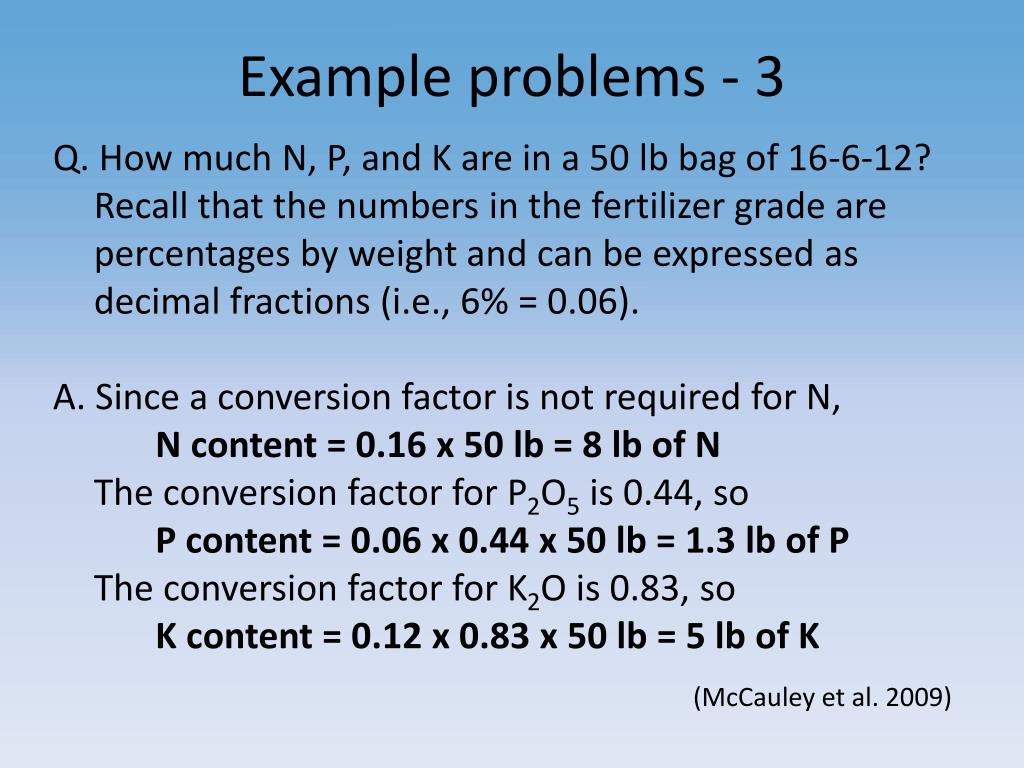 Example problems - 3 Q. How much N, P, and K are in a 50 lb bag of 16-6-12? Recall that the numbers in the fertilizer grade are percentages by weight and can be expressed as decimal fractions (i.e., 6% = 0.06). A. Since a conversion factor is not required for N,N content = 0.16 x 50 lb = 8 lb of N The conversion factor for P2O5 is 0.44, so P content = 0.06 x 0.44 x 50 lb = 1.3 lb of P The conversion factor for K2O is 0.83, soK content = 0.12 x 0.83 x 50 lb = 5 lb of K (McCauley et al. 2009)