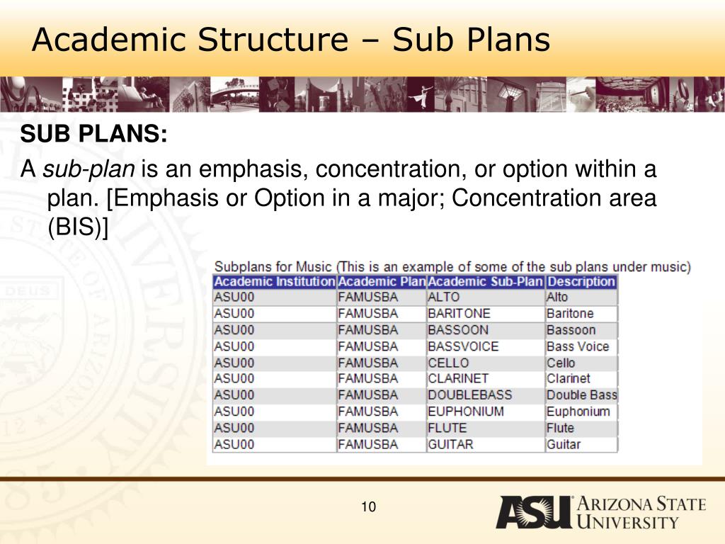 Academic Structure – Sub Plans • SUB PLANS: • A sub-plan is an emphasis, concentration, or option within a plan. [Emphasis or Option in a major; Concentration area (BIS)]