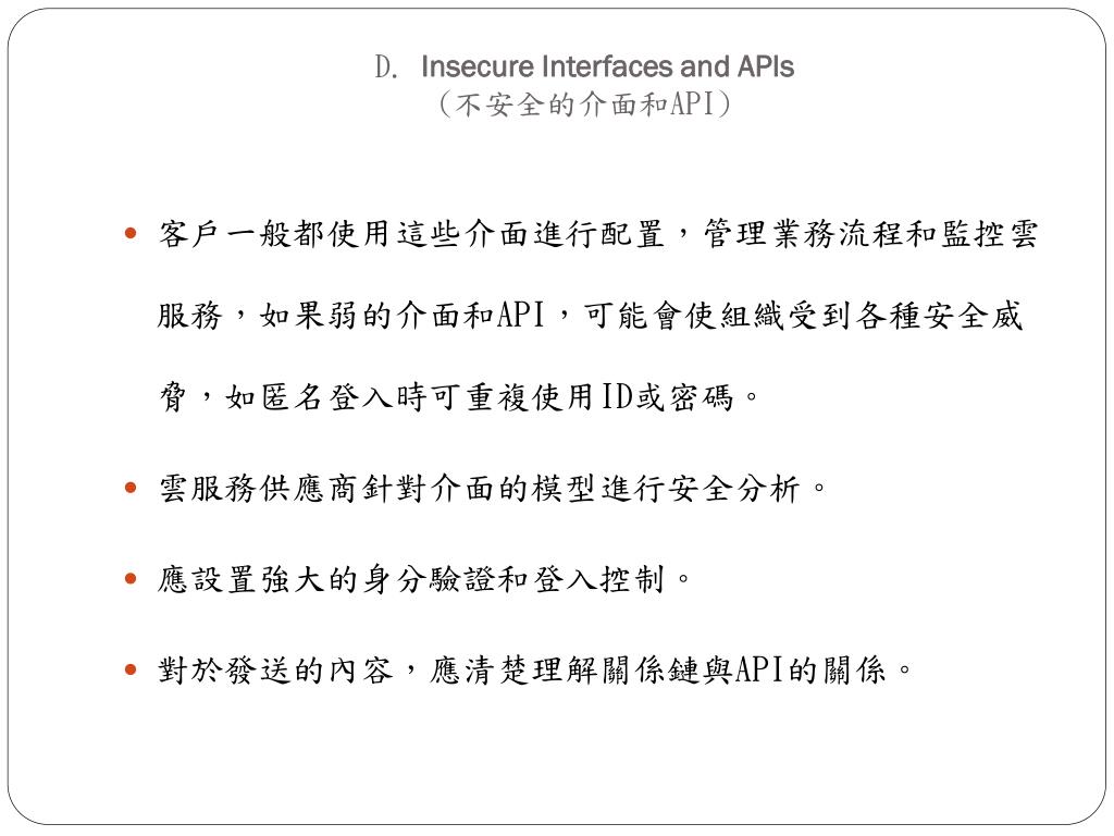 D. Insecure Interfaces and APIs(不安全的介面和API) • 客戶一般都使用這些介面進行配置,管理業務流程和監控雲服務,如果弱的介面和API,可能會使組織受到各種安全威脅,如匿名登入時可重複使用ID或密碼。 • 雲服務供應商針對介面的模型進行安全分析。 • 應設置強大的身分驗證和登入控制。 • 對於發送的內容,應清楚理解關係鏈與API的關係。