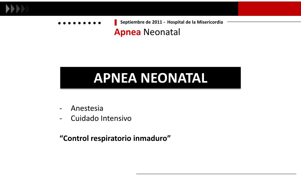 Septiembre de 2011 - Hospital de la Misericordia Apnea Neonatal BASE FISIOLOGICA “Control inmaduro de la respiración” EspontáneaProvocada - Inmadurez innata - Agentes externos - Duración y frecuencia variables APNEA Best Pract Res ClinAnaesthesiol. 2010 Sep;24(3):323-36.