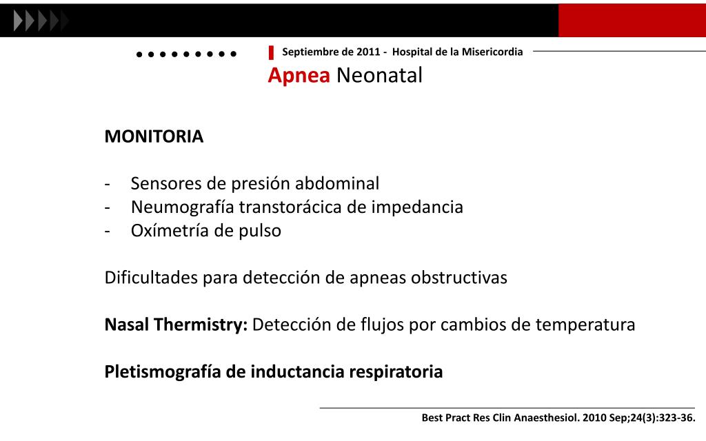 Septiembre de 2011 - Hospital de la Misericordia Apnea Neonatal • MONITORIA • Sensores de presión abdominal • Neumografíatranstorácica de impedancia • Oxímetría de pulso • Dificultades para detección de apneas obstructivas • Nasal Thermistry: Detección de flujos por cambios de temperatura • Pletismografía de inductancia respiratoria Best Pract Res ClinAnaesthesiol. 2010 Sep;24(3):323-36.