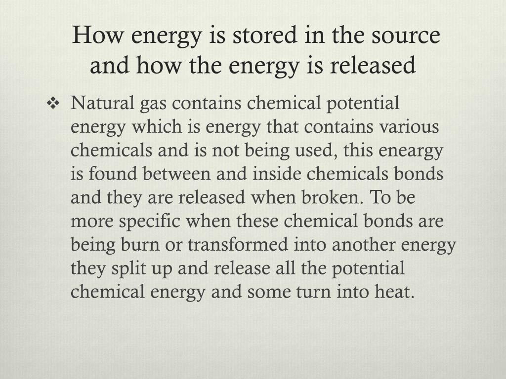 How energy is stored in the source and how the energy is released • Natural gas containschemicalpotentialenergywhichisenergythatcontainsvariouschemicalsandisnotbeingused, thiseneargyisfoundbetweenandinsidechemicalsbondsandthey are releasedwhen broken. To be more specificwhenthesechemicalbonds are beingburnortransformedintoanotherenergytheysplit up andreleaseallthepotentialchemicalenergyandsometurnintoheat.