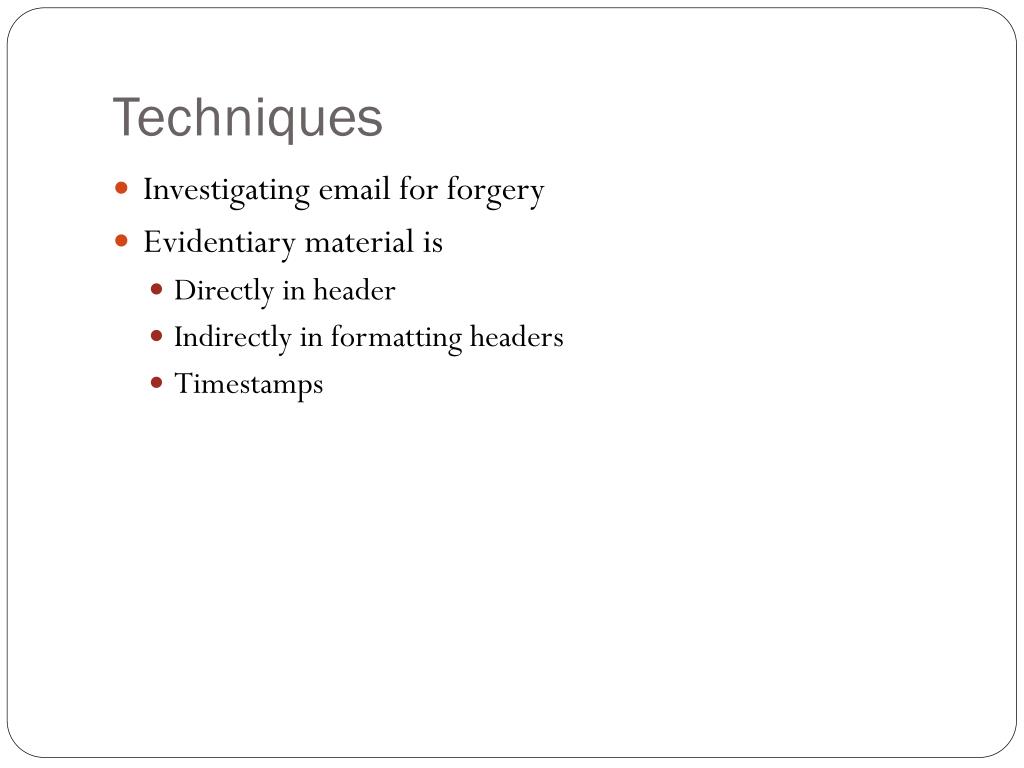 Techniques • Investigating email for forgery • Evidentiary material is • Directly in header • Indirectly in formatting headers • Timestamps