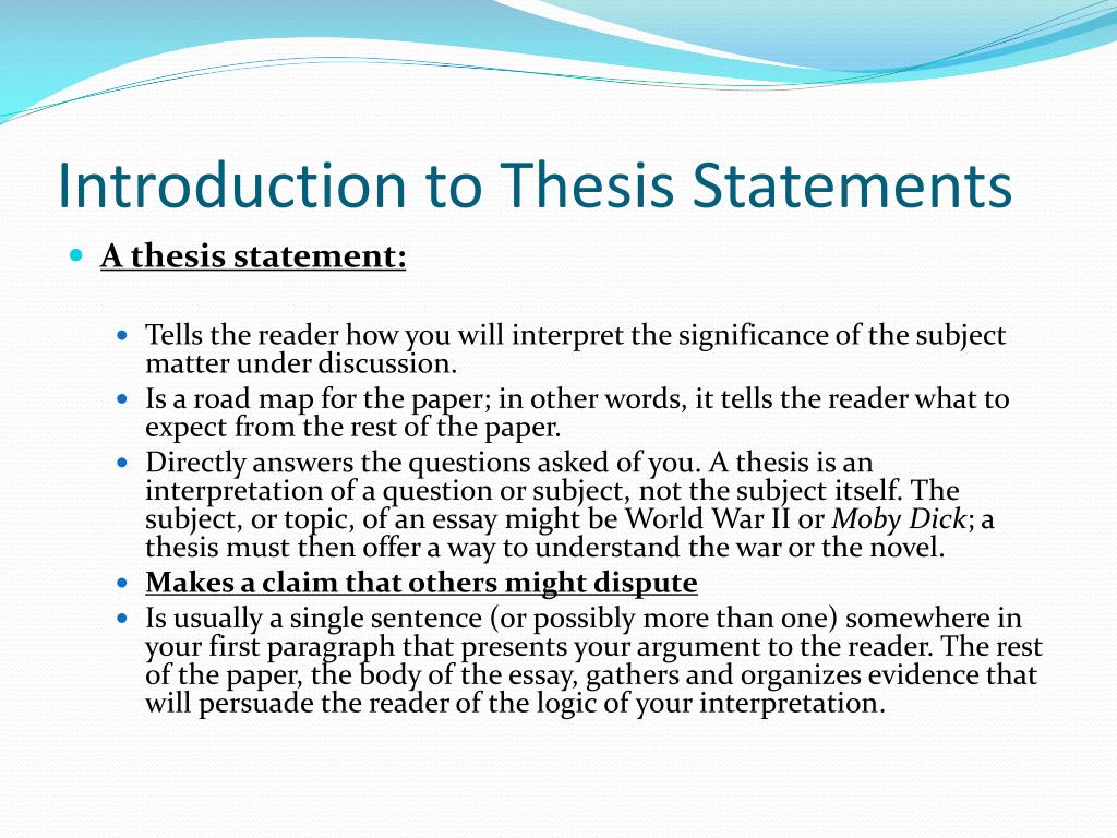 Introduction to Thesis Statements • A thesis statement: • Tells the reader how you will interpret the significance of the subject matter under discussion. • Is a road map for the paper; in other words, it tells the reader what to expect from the rest of the paper. • Directly answers the questions asked of you. A thesis is an interpretation of a question or subject, not the subject itself. The subject, or topic, of an essay might be World War II or Moby Dick; a thesis must then offer a way to understand the war or the novel. • Makes a claim that others might dispute • Is usually a single sentence (or possibly more than one) somewhere in your first paragraph that presents your argument to the reader. The rest of the paper, the body of the essay, gathers and organizes evidence that will persuade the reader of the logic of your interpretation.