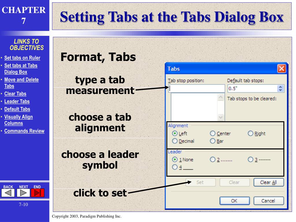 Chapter 7. Signature: Microsoft Word 2003. Chapter 7. MANIPULATING TABS. Set left, right, center, decimal, and bar tabs on the Ruler or at the Tabs dialog box Move, clear, and delete tabs from the Ruler Set leader tabs Reset default tabs Visually align columns of text.