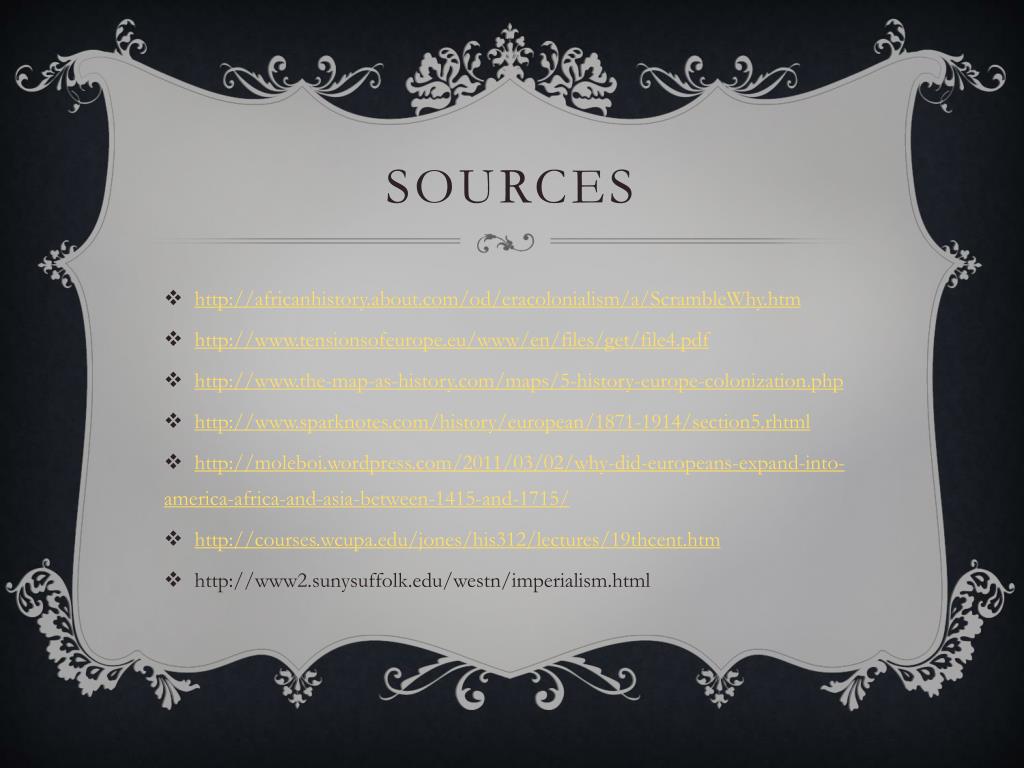 sources • http://africanhistory.about.com/od/eracolonialism/a/ScrambleWhy.htm • http://www.tensionsofeurope.eu/www/en/files/get/file4.pdf • http://www.the-map-as-history.com/maps/5-history-europe-colonization.php • http://www.sparknotes.com/history/european/1871-1914/section5.rhtml • http://moleboi.wordpress.com/2011/03/02/why-did-europeans-expand-into-america-africa-and-asia-between-1415-and-1715/ • http://courses.wcupa.edu/jones/his312/lectures/19thcent.htm • http://www2.sunysuffolk.edu/westn/imperialism.html