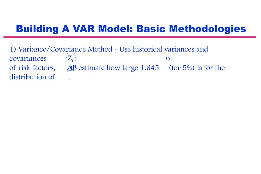 Building A VAR Model: Basic Methodologies 1) Variance/Covariance Method - Use historical variances and covariances of risk factors, , to estimate how large 1.645 (for 5%) is for the distribution of .