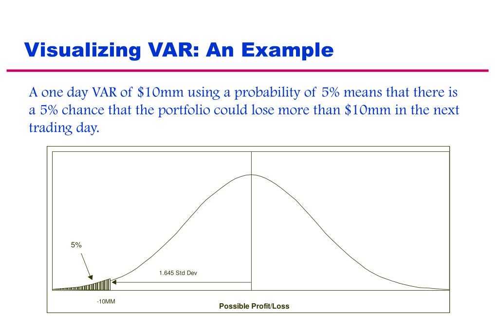 Visualizing VAR: An Example A one day VAR of $10mm using a probability of 5% means that there is a 5% chance that the portfolio could lose more than $10mm in the next trading day.