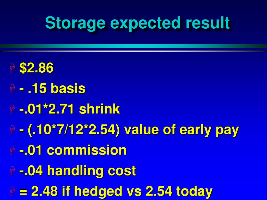Storage expected result • $2.86 • - .15 basis • -.01*2.71 shrink • - (.10*7/12*2.54) value of early pay • -.01 commission • -.04 handling cost • = 2.48 if hedged vs 2.54 today