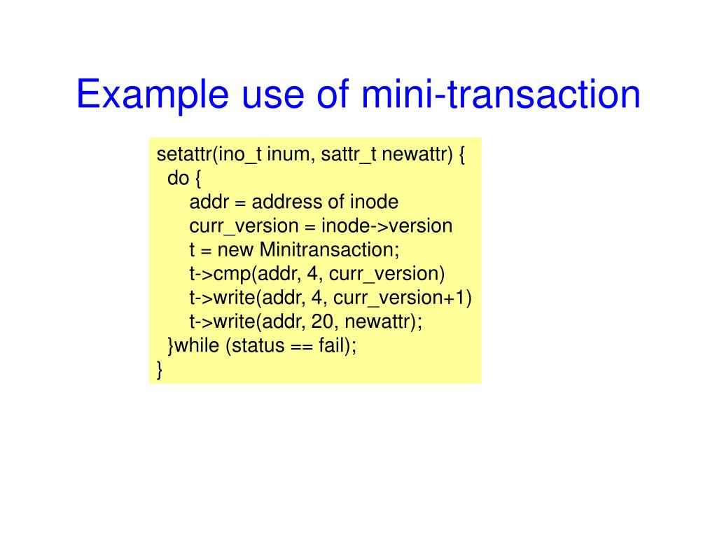 Example use of mini-transaction setattr(ino_t inum, sattr_t newattr) { do { addr = address of inode curr_version = inode->version t = new Minitransaction; t->cmp(addr, 4, curr_version) t->write(addr, 4, curr_version+1) t->write(addr, 20, newattr); }while (status == fail); }