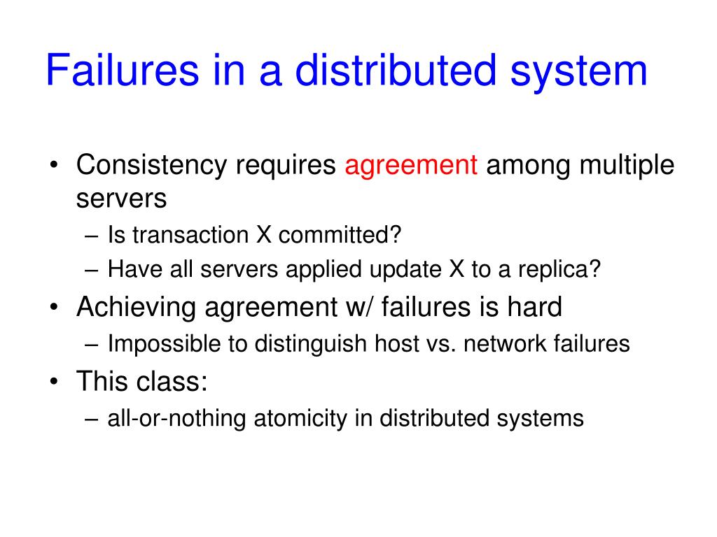 Failures in a distributed system • Consistency requires agreement among multiple servers • Is transaction X committed? • Have all servers applied update X to a replica? • Achieving agreement w/ failures is hard • Impossible to distinguish host vs. network failures • This class: • all-or-nothing atomicity in distributed systems