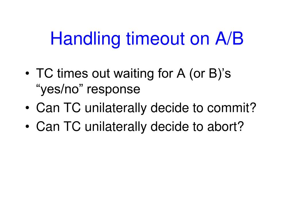 Handling timeout on A/B • TC times out waiting for A (or B)’s “yes/no” response • Can TC unilaterally decide to commit? • Can TC unilaterally decide to abort?