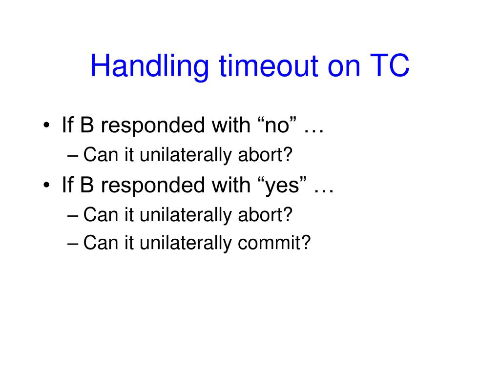 Handling timeout on TC • If B responded with “no” … • Can it unilaterally abort? • If B responded with “yes” … • Can it unilaterally abort? • Can it unilaterally commit?