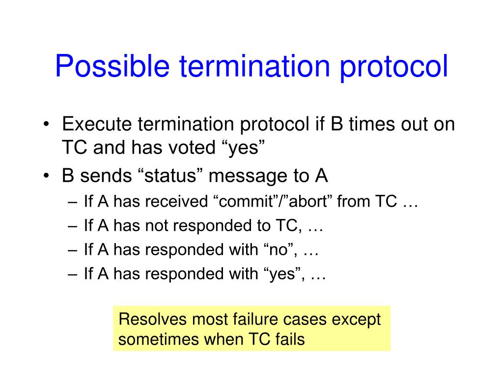 Possible termination protocol • Execute termination protocol if B times out on TC and has voted “yes” • B sends “status” message to A • If A has received “commit”/”abort” from TC … • If A has not responded to TC, … • If A has responded with “no”, … • If A has responded with “yes”, … Resolves most failure cases except sometimes when TC fails