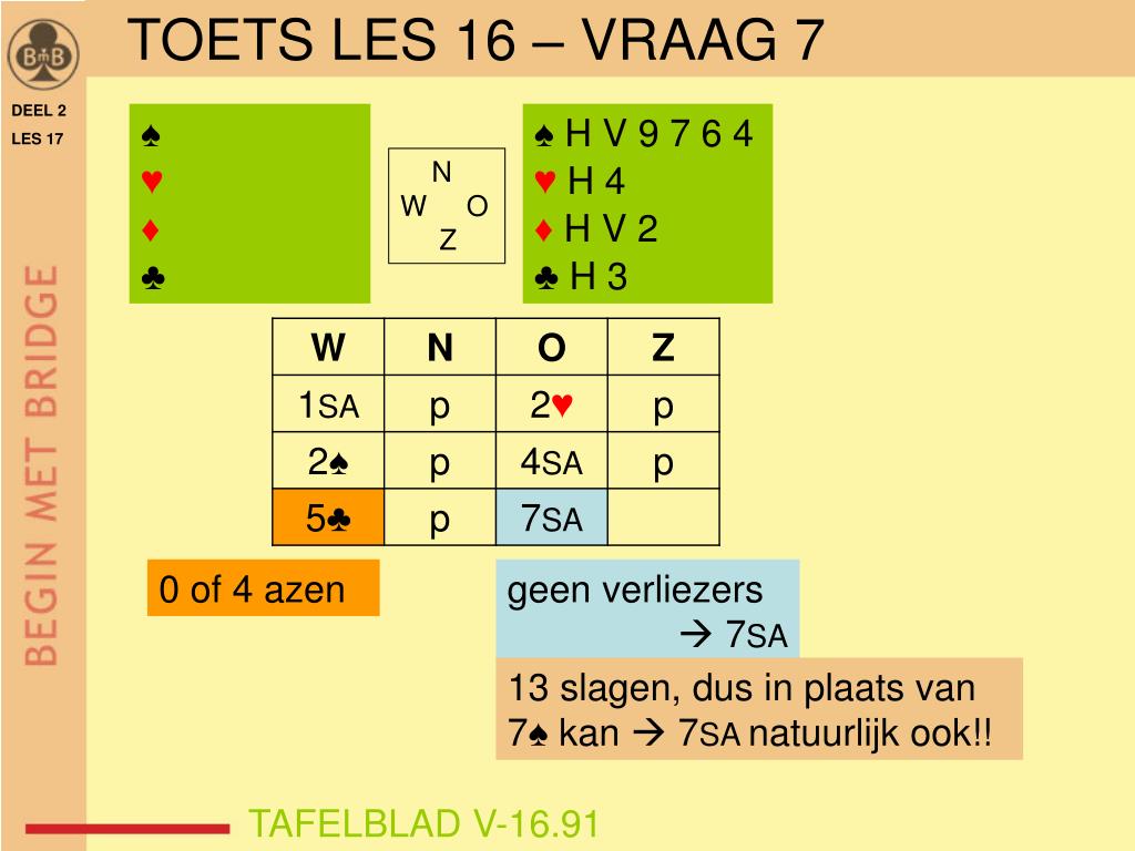 TOETS LES 16 – VRAAG 2 DEEL 2 LES 17 ♠ ♥ ♦ ♣ ♠ H 7 3 ♥ A 9 6 4 ♦ V B 5 ♣ V B 6 N W O Z azen vragen 1 aas 5♦ TAFELBLAD V-16.91