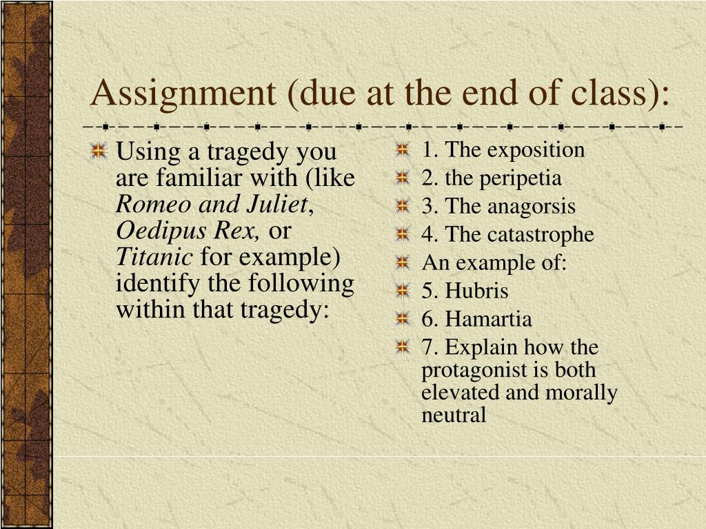 Using a tragedy you are familiar with (like Romeo and Juliet, Oedipus Rex, or Titanic for example) identify the following within that tragedy: 1. The exposition 2. the peripetia 3. The anagorsis 4. The catastrophe An example of: 5. Hubris 6. Hamartia 7. Explain how the protagonist is both elevated and morally neutral Assignment (due at the end of class):