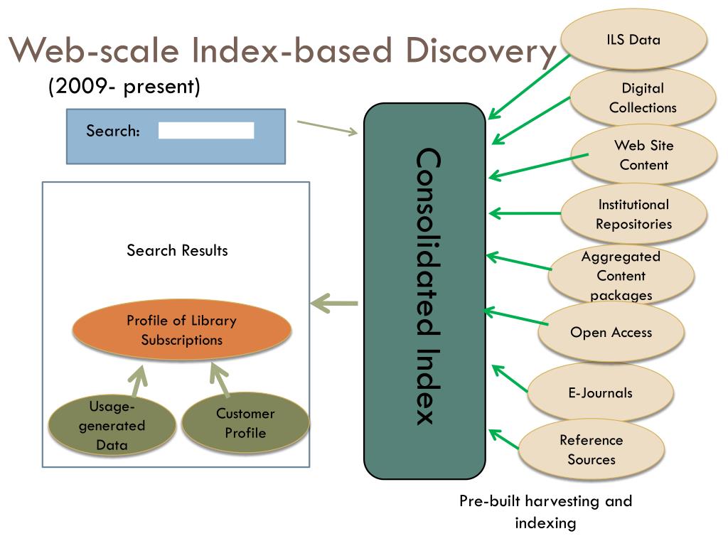 Web-scale Index-based Discovery ILS Data (2009- present) Digital Collections Search: Web Site Content Institutional Repositories Search Results Aggregated Content packages Consolidated Index Profile of Library Subscriptions Open Access … E-Journals CustomerProfile Usage-generatedData Reference Sources Pre-built harvesting and indexing