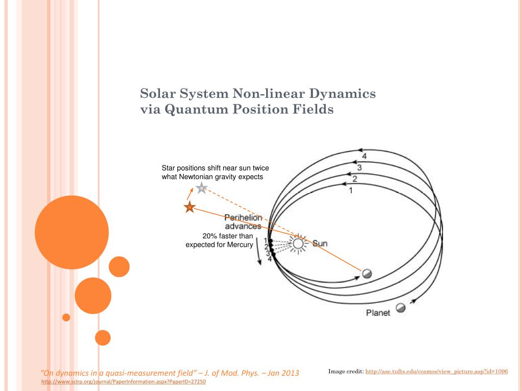 Star positions shift near suntwice what Newtonian gravity expects 20% faster than expected for Mercury Solar System Non-linear Dynamicsvia Quantum Position Fields “On dynamics in a quasi-measurement field” – J. of Mod. Phys. – Jan 2013http://www.scirp.org/journal/PaperInformation.aspx?PaperID=27250 Image credit: http://ase.tufts.edu/cosmos/view_picture.asp?id=1096