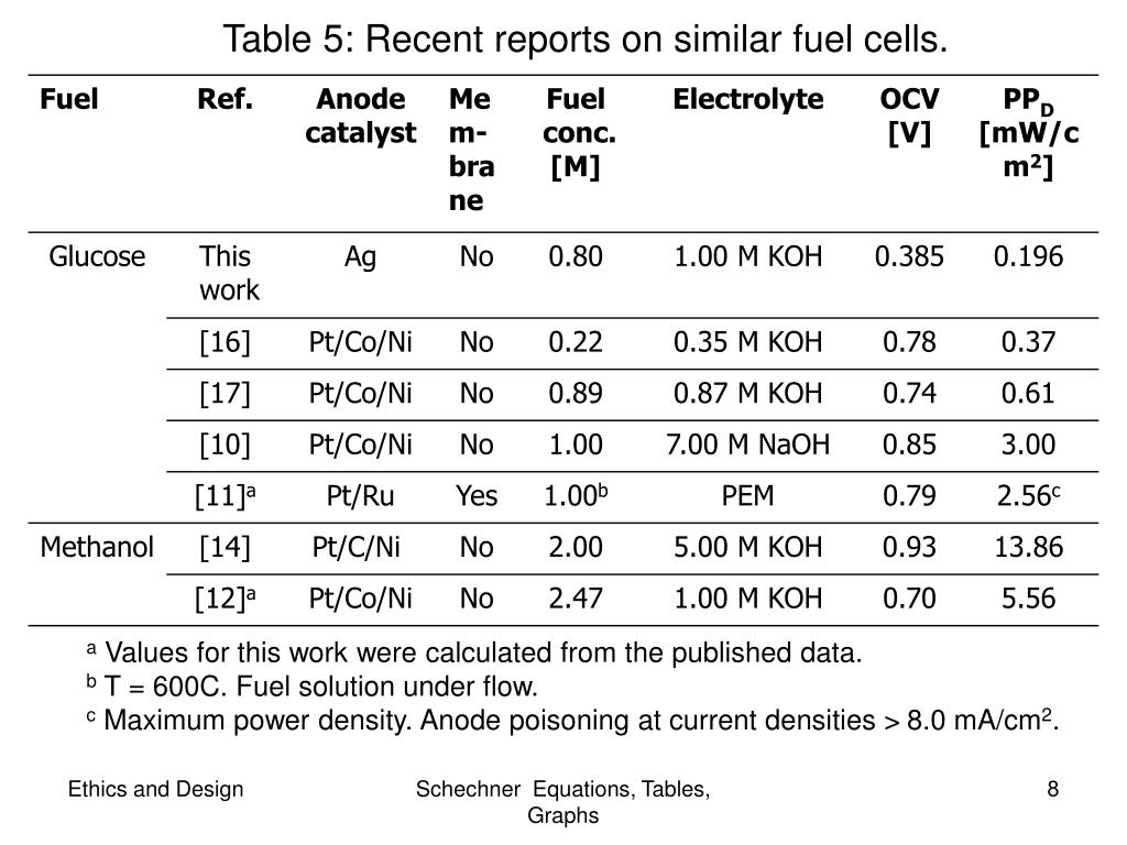 Table 5: Recent reports on similar fuel cells. a Values for this work were calculated from the published data. b T = 600C. Fuel solution under flow. c Maximum power density. Anode poisoning at current densities > 8.0 mA/cm2. Schechner Equations, Tables, Graphs