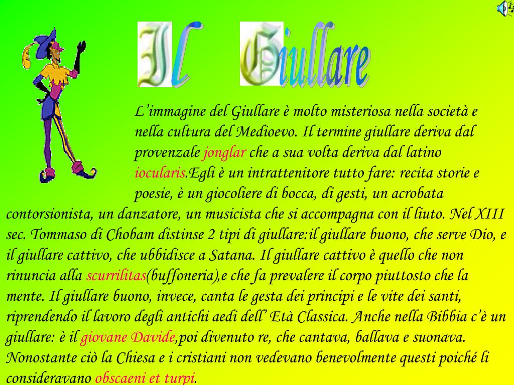 l iullare L’immagine del Giullare è molto misteriosa nella società e nella cultura del Medioevo. Il termine giullare deriva dal provenzale jonglar che a sua volta deriva dal latino iocularis.Egli è un intrattenitore tutto fare: recita storie e poesie, è un giocoliere di bocca, di gesti, un acrobata contorsionista, un danzatore, un musicista che si accompagna con il liuto. Nel XIII sec. Tommaso di Chobam distinse 2 tipi di giullare:il giullare buono, che serve Dio, e il giullare cattivo, che ubbidisce a Satana. Il giullare cattivo è quello che non rinuncia alla scurrilitas(buffoneria),e che fa prevalere il corpo piuttosto che la mente. Il giullare buono, invece, canta le gesta dei principi e le vite dei santi, riprendendo il lavoro degli antichi aedi dell’ Età Classica. Anche nella Bibbia c’è un giullare: è il giovane Davide,poi divenuto re, che cantava, ballava e suonava. Nonostante ciò la Chiesa e i cristiani non vedevano benevolmente questi poiché li consideravano obscaeni et turpi.