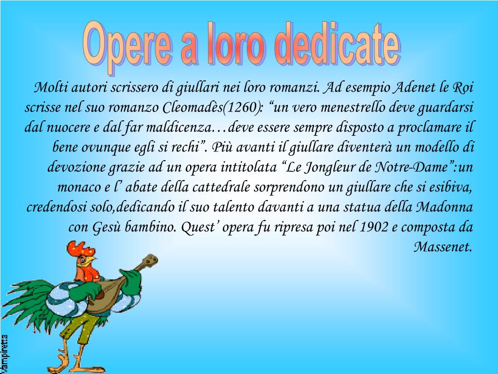 Opere a loro dedicate Molti autori scrissero di giullari nei loro romanzi. Ad esempio Adenet le Roi scrisse nel suo romanzo Cleomadès(1260): “un vero menestrello deve guardarsi dal nuocere e dal far maldicenza…deve essere sempre disposto a proclamare il bene ovunque egli si rechi”. Più avanti il giullare diventerà un modello di devozione grazie ad un opera intitolata “Le Jongleur de Notre-Dame”:un monaco e l’ abate della cattedrale sorprendono un giullare che si esibiva, credendosi solo,dedicando il suo talento davanti a una statua della Madonna con Gesù bambino. Quest’ opera fu ripresa poi nel 1902 e composta da Massenet.