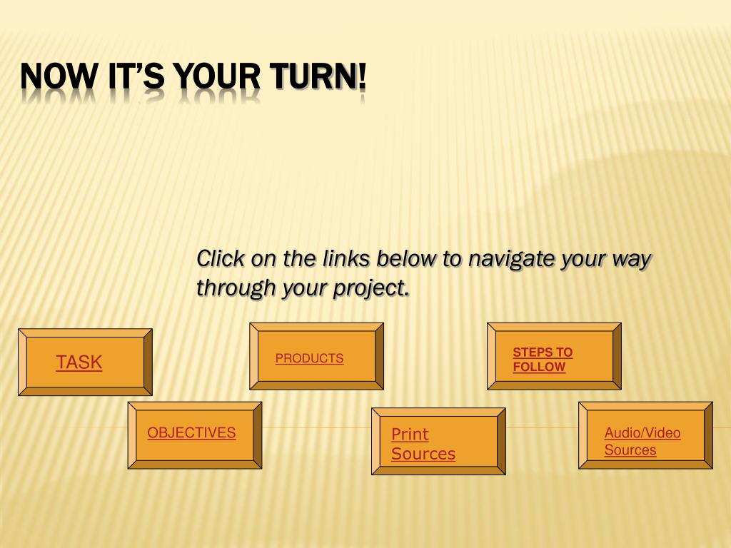 Click on the links below to navigate your way through your project. STEPS TO FOLLOW TASK PRODUCTS Now It’s Your Turn! OBJECTIVES Print Sources Audio/Video Sources