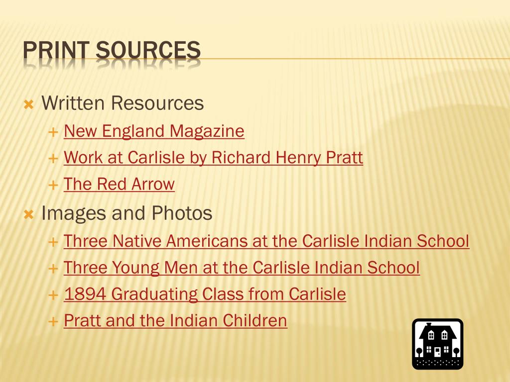 Written Resources • New England Magazine • Work at Carlisle by Richard Henry Pratt • The Red Arrow • Images and Photos • Three Native Americans at the Carlisle Indian School • Three Young Men at the Carlisle Indian School • 1894 Graduating Class from Carlisle • Pratt and the Indian Children Print sources
