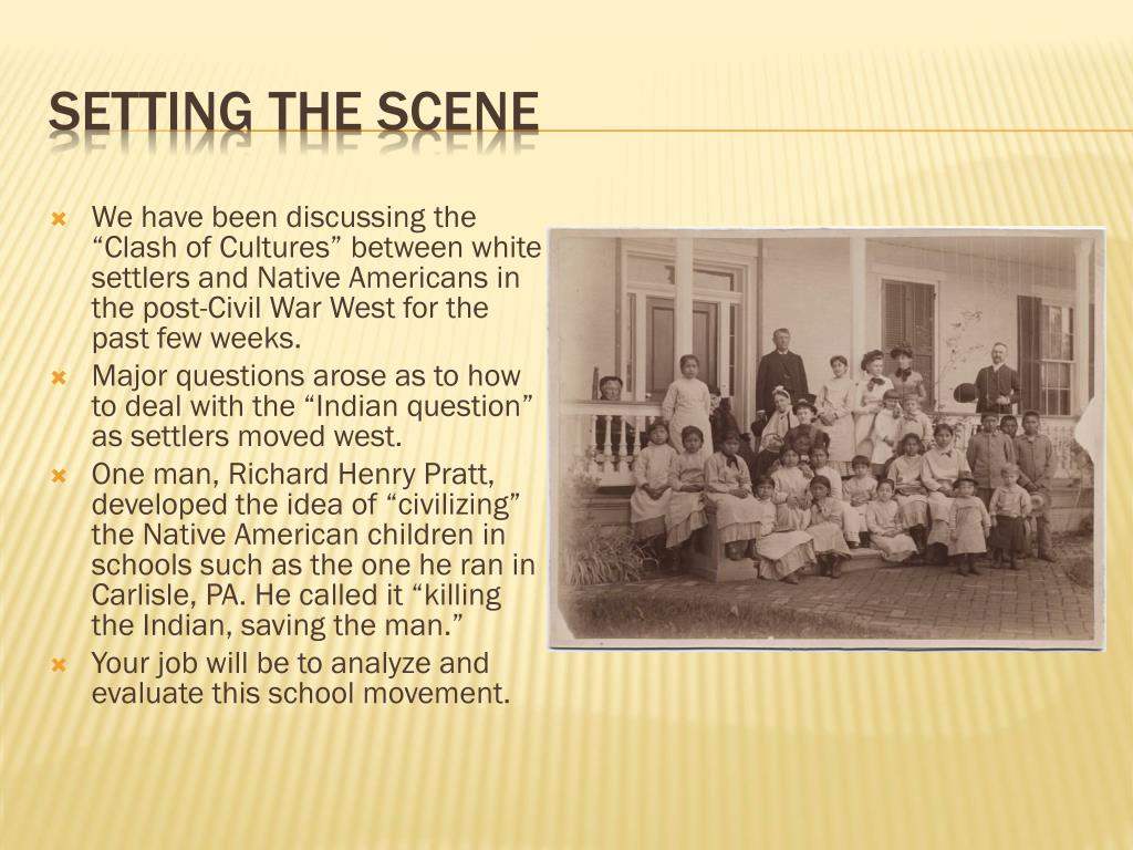 Setting the Scene • We have been discussing the “Clash of Cultures” between white settlers and Native Americans in the post-Civil War West for the past few weeks. • Major questions arose as to how to deal with the “Indian question” as settlers moved west. • One man, Richard Henry Pratt, developed the idea of “civilizing” the Native American children in schools such as the one he ran in Carlisle, PA. He called it “killing the Indian, saving the man.” • Your job will be to analyze and evaluate this school movement.
