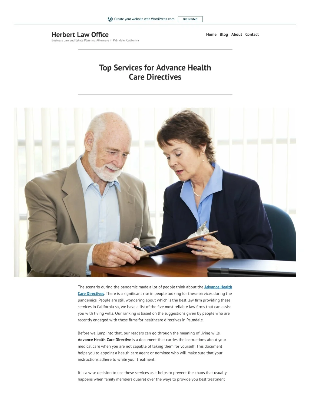 Create your website with WordPress.com Get started Herbert Law Of?ce Business Law and Estate Planning Attorneys in Palmdale, California Home Blog About Contact Top Services for Advance Health Care Directives The scenario during the pandemic made a lot of people think about the Advance Health Care Directives. There is a signi?cant rise in people looking for these services during the pandemics. People are still wondering about which is the best law ?rm providing these services in California so, we have a list of the ?ve most reliable law ?rms that can assist you with living wills. Our ranking is based on the suggestions given by people who are recently engaged with these ?rms for healthcare directives in Palmdale. Before we jump into that, our readers can go through the meaning of living wills. Advance Health Care Directive is a document that carries the instructions about your medical care when you are not capable of taking them for yourself. This document helps you to appoint a health care agent or nominee who will make sure that your instructions adhere to while your treatment. It is a wise decision to use these services as it helps to prevent the chaos that usually happens when family members quarrel over the ways to provide you best treatment
