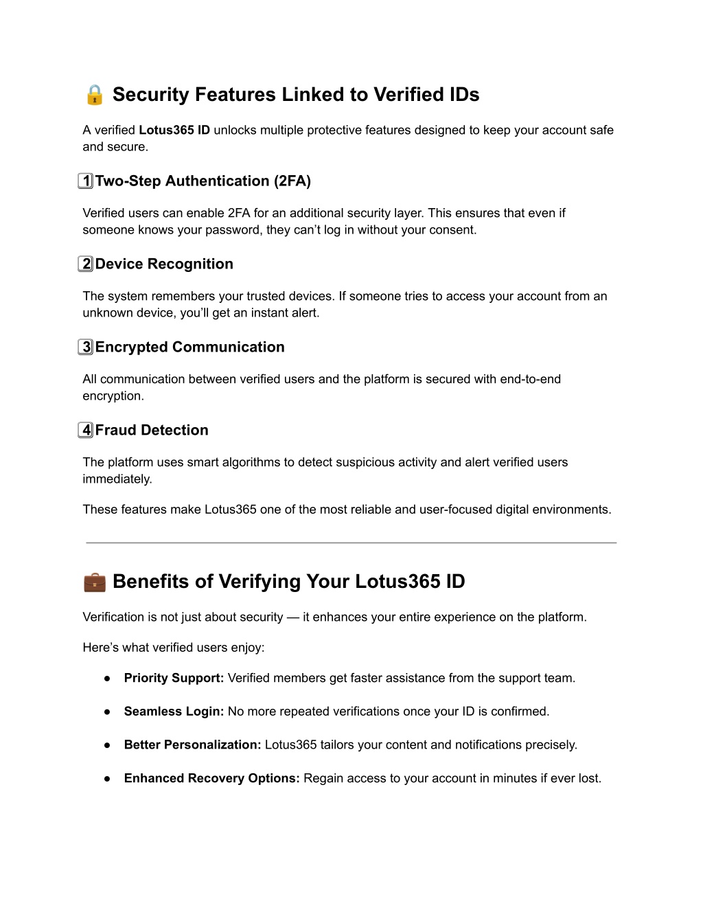 ? Security Features Linked to Verified IDs A verified Lotus365 ID unlocks multiple protective features designed to keep your account safe and secure. 1⃣ Two-Step Authentication (2FA) Verified users can enable 2FA for an additional security layer. This ensures that even if someone knows your password, they can’t log in without your consent. 2⃣ Device Recognition The system remembers your trusted devices. If someone tries to access your account from an unknown device, you’ll get an instant alert. 3⃣ Encrypted Communication All communication between verified users and the platform is secured with end-to-end encryption. 4⃣ Fraud Detection The platform uses smart algorithms to detect suspicious activity and alert verified users immediately. These features make Lotus365 one of the most reliable and user-focused digital environments. ? Benefits of Verifying Your Lotus365 ID Verification is not just about security — it enhances your entire experience on the platform. Here’s what verified users enjoy: ● Priority Support: Verified members get faster assistance from the support team. ● Seamless Login: No more repeated verifications once your ID is confirmed. ● Better Personalization: Lotus365 tailors your content and notifications precisely. ● Enhanced Recovery Options: Regain access to your account in minutes if ever lost.