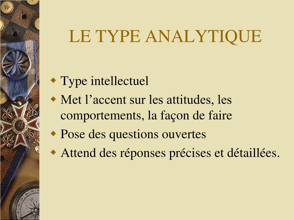 LE TYPE ANALYTIQUE • Type intellectuel • Met l’accent sur les attitudes, les comportements, la façon de faire • Pose des questions ouvertes • Attend des réponses précises et détaillées.