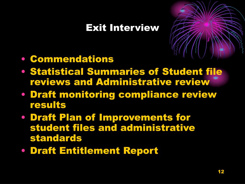 Exit Interview • Commendations • Statistical Summaries of Student file reviews and Administrative review • Draft monitoring compliance review results • Draft Plan of Improvements for student files and administrative standards • Draft Entitlement Report