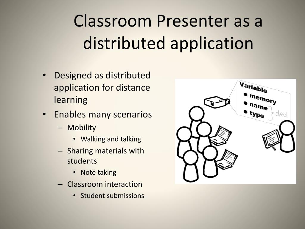 Classroom Presenter as a distributed application • Designed as distributed application for distance learning • Enables many scenarios • Mobility • Walking and talking • Sharing materials with students • Note taking • Classroom interaction • Student submissions